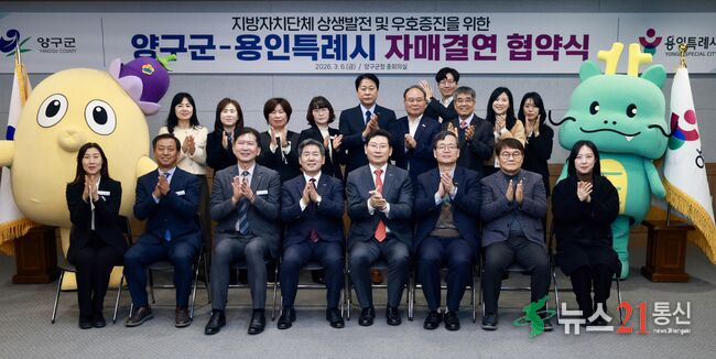 용인특례시(시장 이상일)는 6일 강원특별자치도 양구군(군수 서흥원)과 자매결연을 하고, 두 도시의 교류와 발전을 위해 적극 협력하기로 했다. 이상일 시장은 이날 양구군청 중회의실에서 서흥원 군수와 두 도시 간 우의를 증진하고 상호 교류‧협력하는 데 합의하고, 자매결연 협약서에 서명했다. 이번 협약으로 양구군은 시의 16번째 자매...