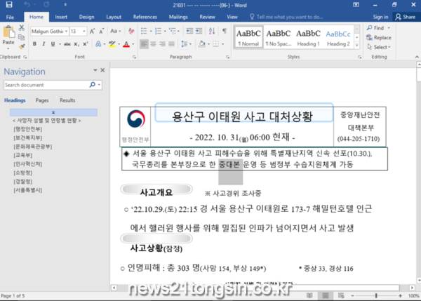 해당 파일은 중앙재난안전대책본부 보고서 양식을 모방해 작성됐으며, 사고개요와 인명피해, 조치 상황 등이 자세히 적혀 있다.