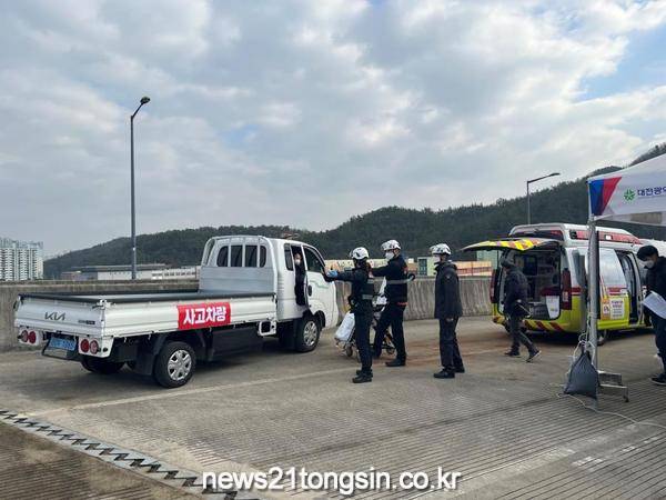 대전시는 7일 오후 서구 가수원동 구봉로 정림대교 위에서 겨울철 자연재난 대비를 위한 ‘2022년 겨울철 스마트 폭설대응 현장훈련’을 실시했다.