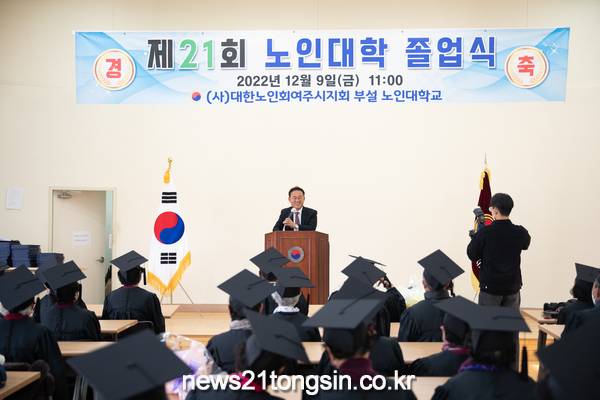 지난 9일 여주시(시장 이충우)는 사)대한노인회 여주시지회(지회장 김병옥) 주관으로 여주노인대학(대학장 박정수) 52명 학생들의 ‘제21회 여주노인대학 졸업식’을 개최했다.
