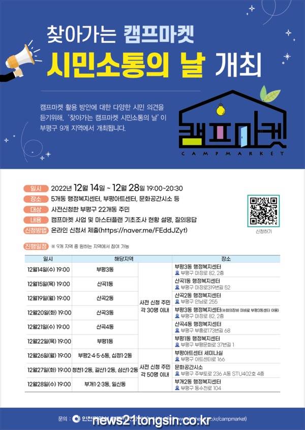 인천광역시(시장 유정복)는 캠프마켓이 위치한 부평구 9개 지역에서 캠프마켓 활용방안에 대한 ‘찾아가는 캠프마켓 시민소통의 날’(이하 숙의경청회)을 개최한다고 밝혔다.