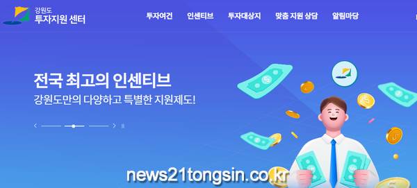 강원도는 투자정보 통합 제공 및 투자유치 활동 효율화를 위하여 「강원도 투자지원 센터」 웹사이트(www.gangwoninvest.com)를 구축하여 12월 12일부터 운영한다고 밝혔다.