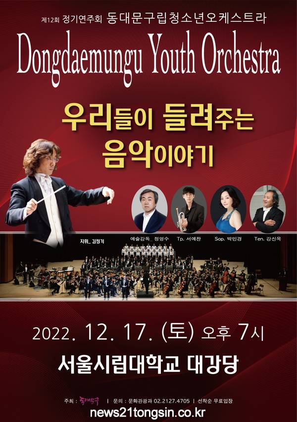 이필형 동대문구청장은 “올 한 해를 마무리하는 12월에 정기연주회로 아름다운 낭만과 추억을 선사하고자 한다”며, “주민분들의 많은 관심과 참여를 부탁드리며 앞으로도 주민들에게 다양한 문화 향유 기회를 제공할 수 있도록 노력하겠다”고 밝혔다.