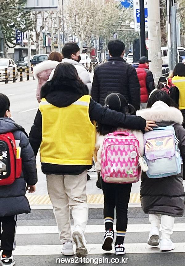 ▲ 사진=용두초 교통안전지도사가 아이들과 하교하고 있다.동대문구(구청장 이필형)가 안전한 등하굣길 조성을 위해 시행 중인 어린이 교통안전지도사업이 2023년에는 확대 운영된다.
