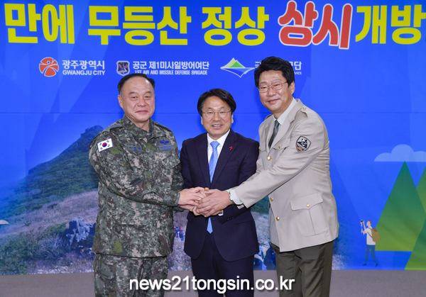 광주광역시(시장 강기정)는 공군 제1미사일방어여단, 국립공원공단과 함께 20일 오전 11시 동구 무등산국립공원사무소에서 ‘무등산 정상 상시 개방을 위한 업무협약’을 체결했다.
