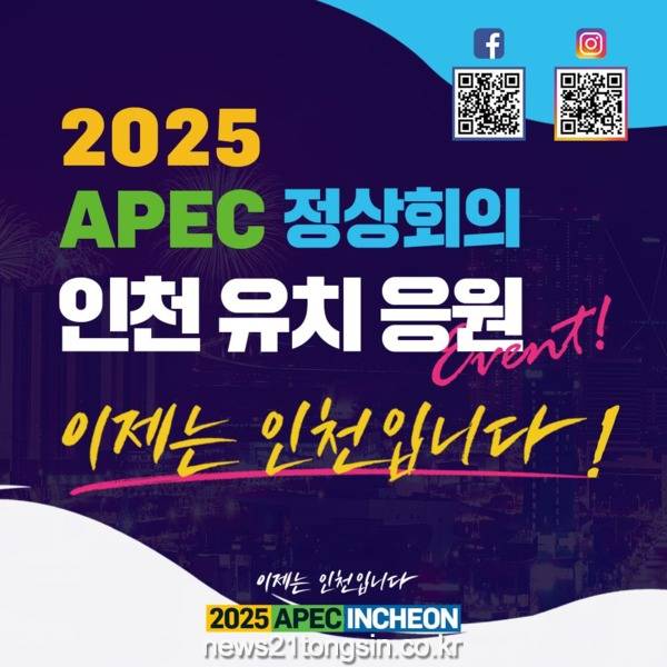 인천광역시(시장 유정복)은 2025년 대한민국에서 개최가 확정된 아시아‧태평양경제협력체(Asia-Pacific Economic Cooperation, APEC) 정상회의의 인천 유치를 위한 공식 소셜 미디어(SNS) 응원 이벤트를 실시한다고 밝혔다.