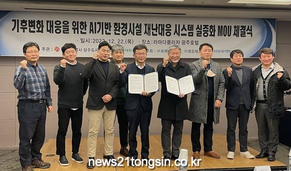 시 상수도사업본부와 전남대는 22일 상수도 시설물의 재난정보를 감시할 수 있는 센서 및 모니터링 체계 구축을 위해 ‘인공지능(AI) 기반 환경시설 재난대응 의사결정지원 시스템 실증화 기술 개발을 위한 업무협약’을 체결했다.