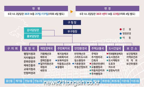 이번 조직개편을 통해 현재 6국 1소 2담당관 38과 14동 217팀 1T/F팀이었던 동대문구 조직은 6국 1소 2담당관 38과 1센터 14동 223팀으로 변경된다.