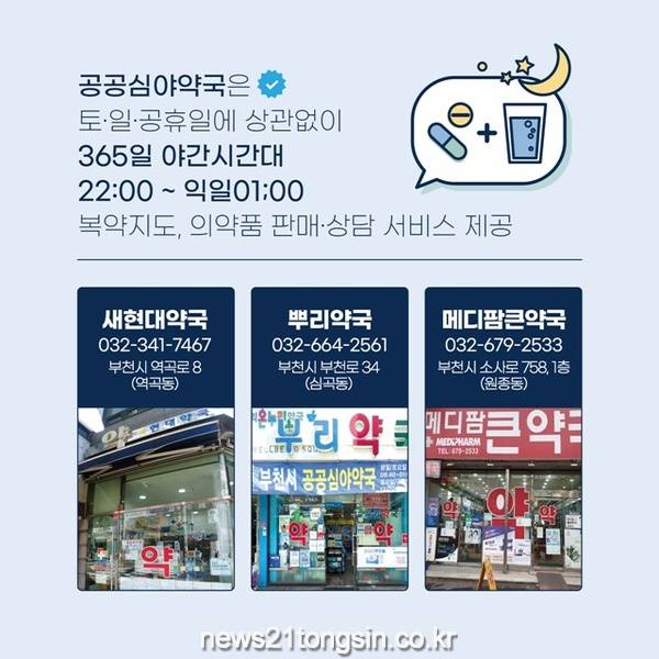 부천시에서 운영하고 있는 공공심야약국은 역곡동 ‘새현대약국’, 심곡동 ‘뿌리약국’, 원종동 ‘메디팜큰약국’ 3곳이다.