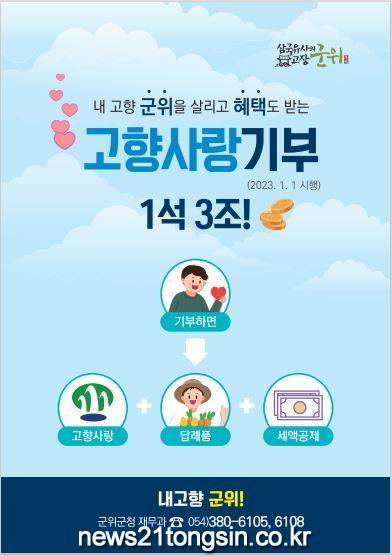 올해 1월 1일부터 고향사랑기부제가 전국적으로 시행된 가운데 경상북도 군위군에서는 내 고향 군위군에 사랑의 마음을 전하는 기부자들의 행렬이 이어지고 있다.