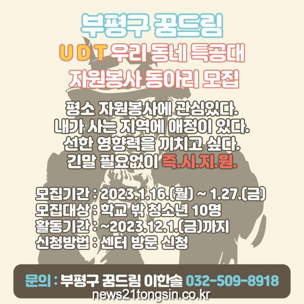 부평구(구청장 차준택)학교밖청소년지원센터가 오는 16일부터 27일까지 2023년 UDT자원봉사동아리 2기 동아리원을 모집한다.