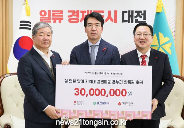 대전시(시장 이장우)는 17일 대전시청에서 ㈜대전신세계 윤석희 대표이사가 설 명절맞이 취약계층 아동을 위해 사용해 달라며 3천만 원을 대전사회복지공동모금회에 전달했다고 밝혔다.