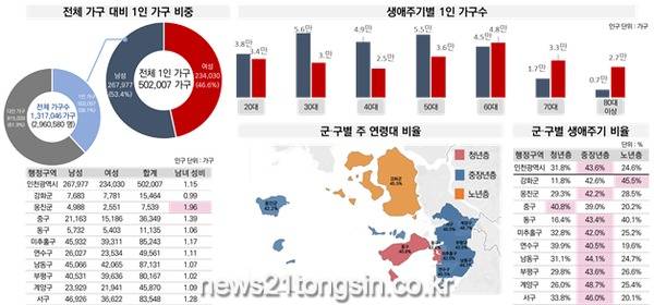 한편, 지난해 12월 기준 행정안전부 주민등록 인구통계에 따르면 인천시의 1인가구는 약 50만가구로 전체가구의 38.1%로 나타났으며, 전국 평균 41.0%, 서울시의 43.9%, 경기도의 37.2%가 1인가구다.