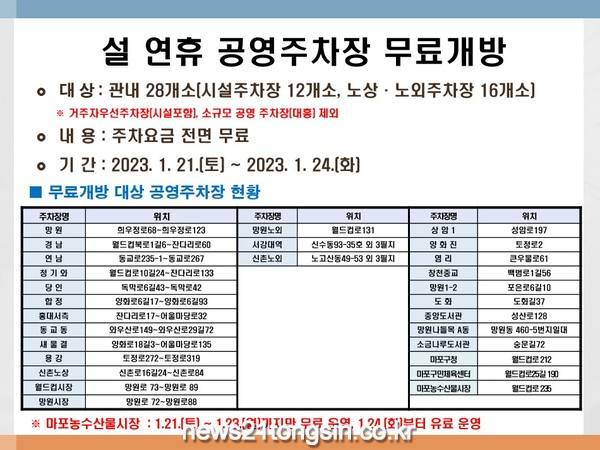 한편, 금년에는 공영주차장과 별도로 마포구청, 마포구민체육센터, 마포농수산물시장 내 공공주차장 또한 주차장 이용자에게 무료로 개방할 예정이다. 이 중 마포농수산물시장 내 공공주차장은 1월 21일부터 23일까지 3일간 무료 운행하고 24일부터는 유료로 운영된다.