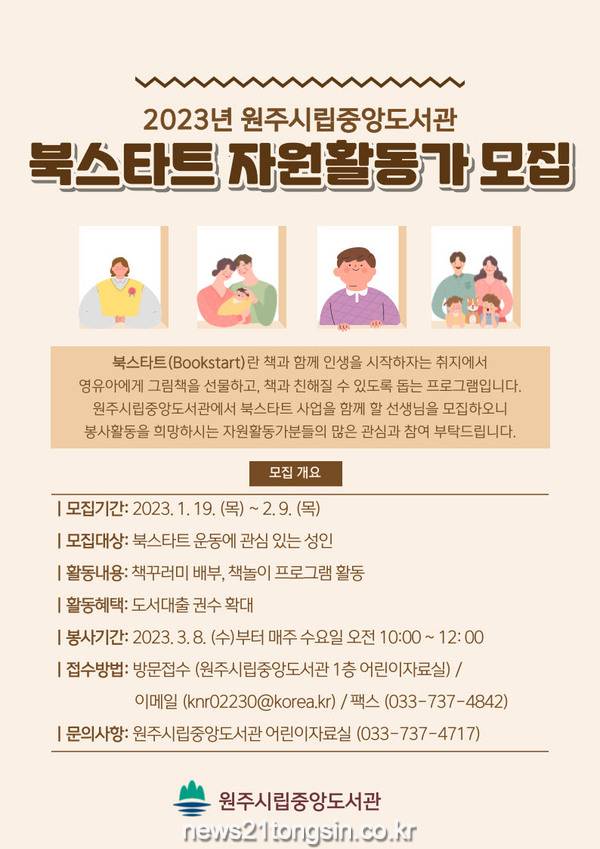원주시립중앙도서관은 오는 19일부터 북스타트 자원활동가를 모집한다고 밝혔다.