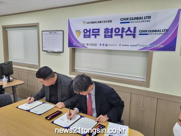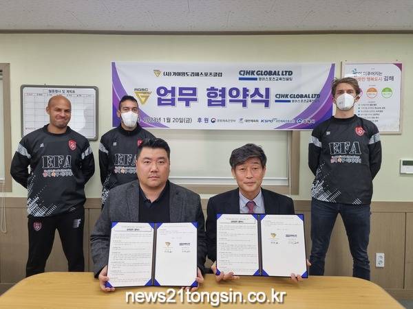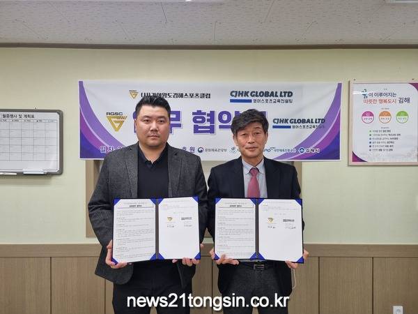(사)가야왕도김해스포츠클럽 (이사장 장성동)은 지난 20일 해외 스포츠 교육 컨설팅 전문 회사 (CJHK GLOBAL LTD 대표 김정훈)와 2023년부터 김해시 유.청소년들의 건강과 학부모들의 사교육비 절감 위해 영어축구교실을 운영하기위해 업무협약을 가졌다.