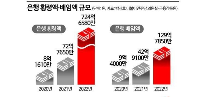 은행권 횡령액 규모는 2020년 8억1610만원에서 2021년 72억7650만원, 지난해는 724억6580만원으로 매년 증가했다.
