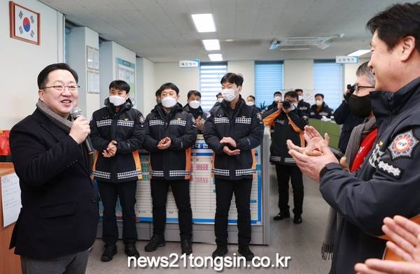 이 시장은 첫 방문지로 서부소방서를 찾아 명절 연휴기간 시민 안전을 위해 최일선 현장에서 고생하는 소방공무원들을 격려했다.