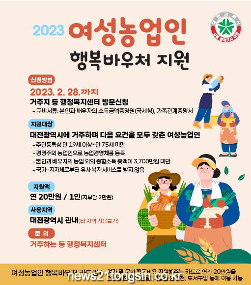대전시는 여성농업인들의 삶의 질 향상을 위해 추진하고 있는 ‘여성농업인 행복바우처 지원사업’을 이달 26일부터 다음 달 28일까지 신청․접수한다고 밝혔다.