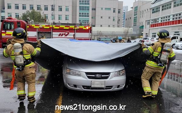 이날 훈련은 질식소화덮개로 차량을 덮어 연소확대를 방지하고, 이동식 침수조를 활용해 화재를 진압하는 방식으로 현장지휘관 30여 명이 참여한 가운데 진행됐다.