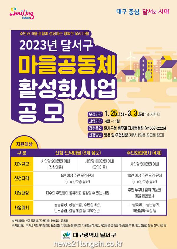 (뉴스21통신) 박창남기자 = 대구 달서구(구청장 이태훈)는 3월 3일까지 이웃 간 배려하고 소통하는 공동체 문화 확산을 위해‘2023년 마을공동체 활성화사업’참가단체를 공모한다고 밝혔다.