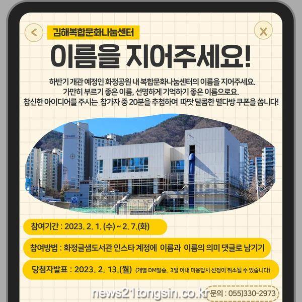 홍태용 시장은 “지역의 새로운 문화 랜드마크가 될 김해복합문화나눔센터가 주민들의 관심과 호응 속에 개관할 수 있도록 이름부터 함께 지어주시길 기대한다”고 말했다.