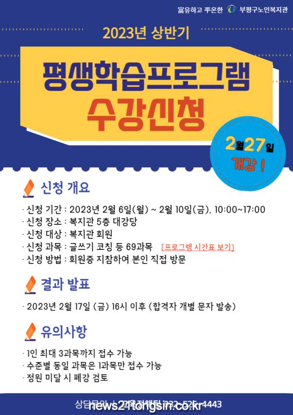 부평구노인복지관(관장:최민수)은 부평구 내 어르신을 대상으로 오는 6일부터 10일까지 5일간 2023년 상반기 노년사회화교육인 학습자 중심의 맞춤형 평생학습 프로그램 수강생 1,665명을 모집한다고 밝혔다.