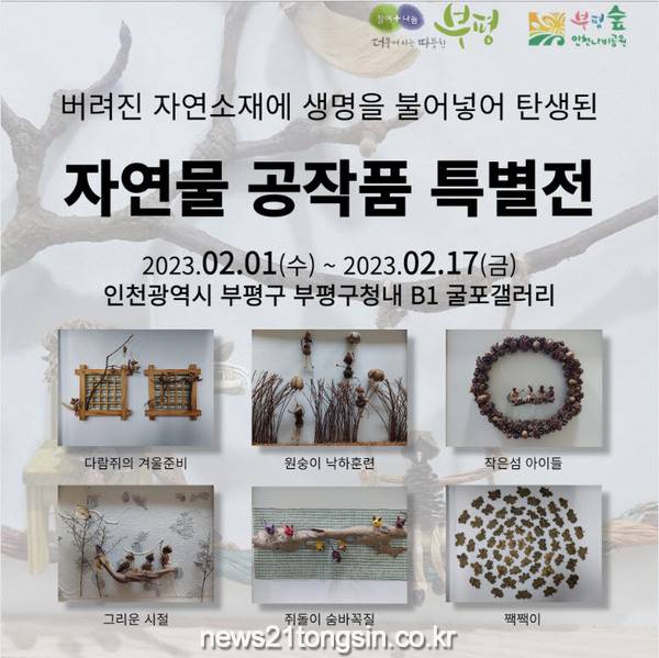 부평구(구청장 차준택)가 오는 17일까지 구청 미술전시관에서 ‘자연물 공작품 특별전’을 전시한다.
