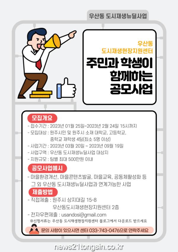 우산동 도시재생현장지원센터(센터장 김상호)는 우산동 도시재생 뉴딜사업의 일환으로 ‘2023년 우산동 도시재생, 주민과 학생이 함께하는 공모사업(1차)’을 추진한다.
