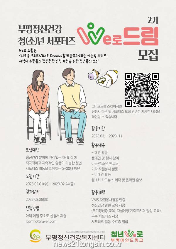 차준택) 부평정신건강복지센터가 오는 28일까지 부평정신건강 청(소부평구(구청장 )년 서포터즈 ‘We로드림’ 2기를 모집한다.