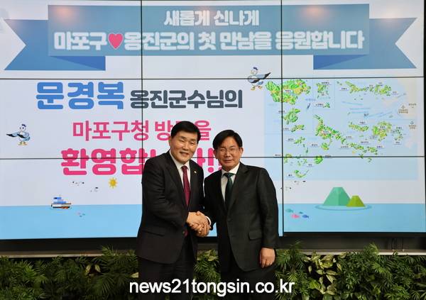 박강수 마포구청장이 2일 오전, 자매결연 협의 및 기관 간의 우호교류를 위해 마포구를 방문한 문경복 옹진군수와 간담회를 가졌다.