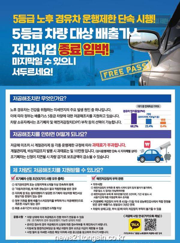 원주시 관계자는 “5등급 경유차의 경우 저공해 조치 지원이 종료될 예정인 만큼, 올해까지 꼭 신청해 지원받길 바란다.”라며, “올해 처음 시행되는 4등급 경유차 소유자분들도 많은 신청부탁드린다.”라고 말했다.