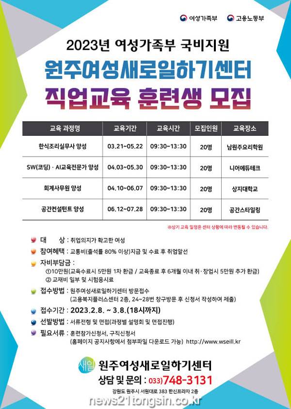 원주여성새로일하기센터는 3월 21일부터 7월 28일까지 2023년 직업교육 훈련 프로그램을 운영한다.
