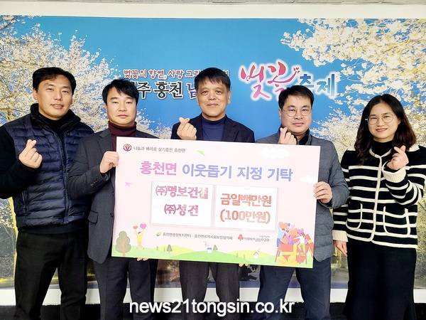 지난 2월 9일(목) 여주시 소재한 ㈜명보건설(대표 안영모), ㈜성건(대표 김성현)은 흥천면 행정복지센터를 방문해 이웃돕기 성금 100만원을 기탁했다.