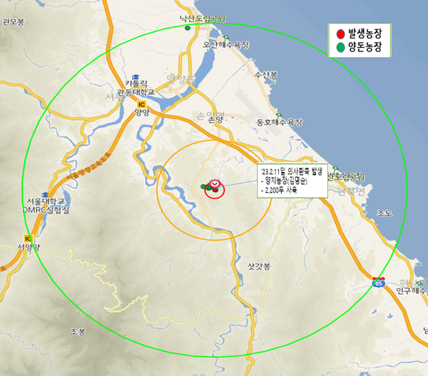 ※ 발생농가는 양양축산양돈영농조합 양돈 밀집단지내 농가임(발생농장 포함 8호 22,675두 사육)