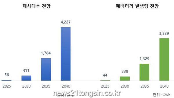 폐배터리 발생량도 2025년 44기가와트시에서 2030년 338기가와트시, 2035년 1천 329기가와트시, 2040년 3천 339기가와트시로 증가할 것으로 예상된다.