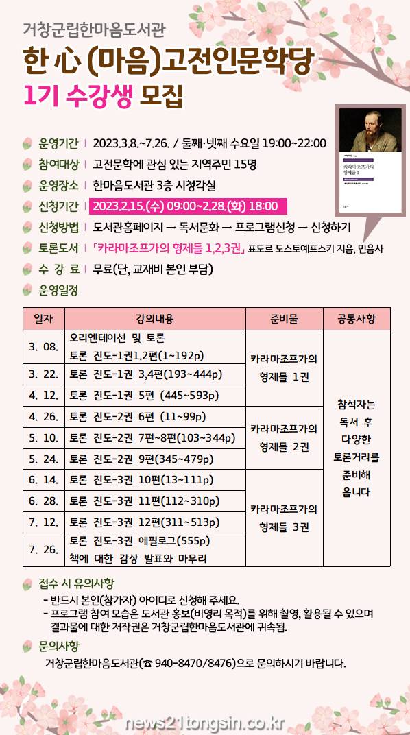 거창군립한마음도서관은 오는 15일부터 28일까지 고전문학에 관심 있는 지역주민들을 대상으로 한心(마음)고전인문학당 1기 수강생을 모집한다고 전했다.