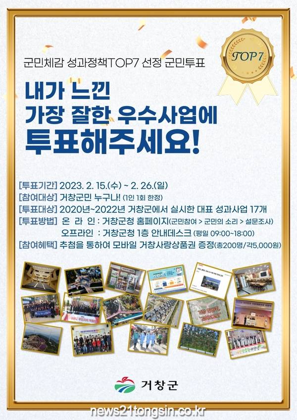거창군은 오는 26일까지 ‘군민체감 성과정책 TOP7’ 선정을 위한 군민투표를 실시한다고 15일 전했다.