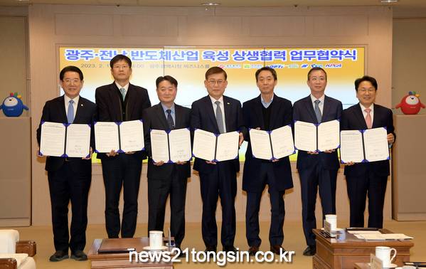 광주광역시와 전라남도는 15일 광주시청 비즈니스룸에서 강기정 시장과 김영록 도지사 등이 참석한 가운데 반도체 관련 5개 기관과 ‘광주전남 반도체 산업육성을 위한 상생협력 업무협약’을 체결했다고 밝혔다.