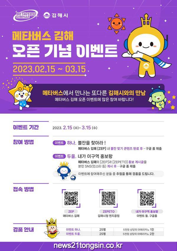 더불어 시는 메타버스 김해의 다채로운 매력을 느낄 수 있도록 이날부터 3월 15일까지 △뿔잔을 찾아라 △내가 이구역 홍보왕 오픈 기념 이벤트를 마련한다.