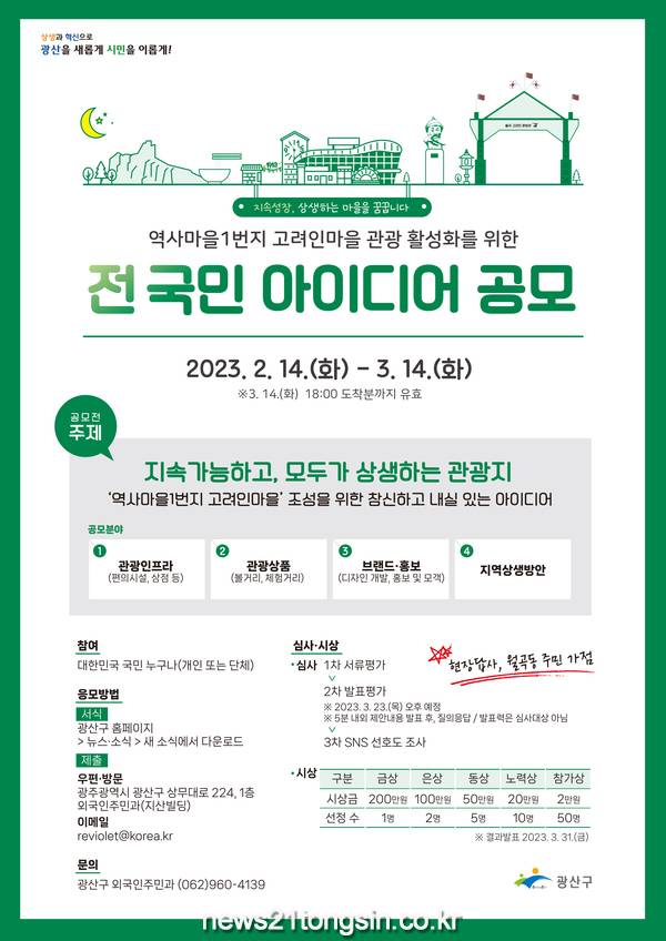 공모 기간은 3월14일까지며, 지역이나 연령 제한 없이 누구나, 우편‧방문(광주 광산구 외국인주민과) 또는 이메일(reviolet@korea.kr)로 참여할 수 있다.