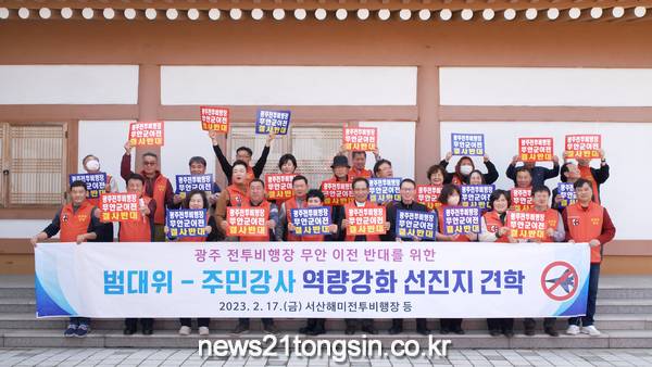 [뉴스21통신/조영기 기자] 광주 전투비행장 무안 이전 반대 범군민대책위원회(이하 범대위)와 주민주도형 주민강사(이하 주민강사) 등이 지난 17일 서산전투비행장 소음피해 대책위를 방문하여 전투비행장 소음피해 현장 견학을 실시했다.