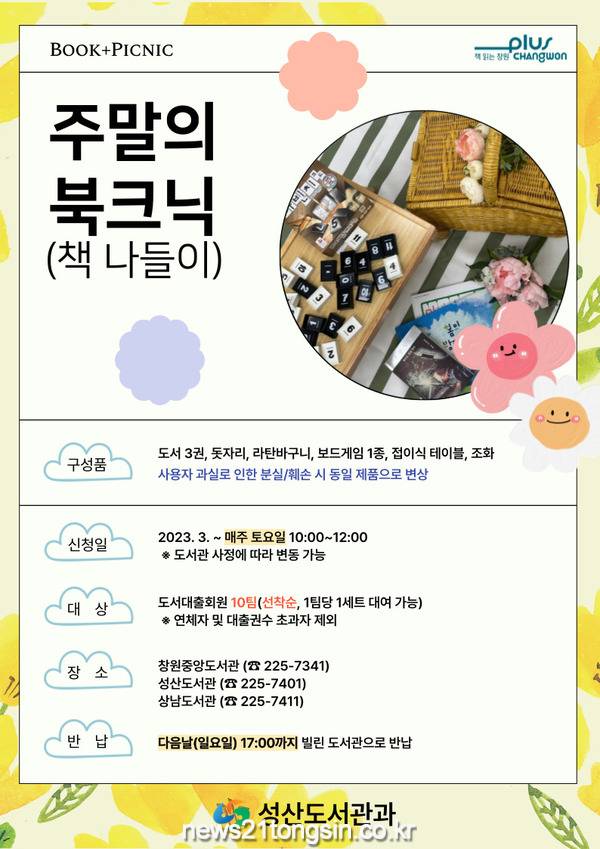 성산도서관과(과장 박경란)는 탁트인 하늘과 시원한 바람을 만끽하며 독서할 수 있는 특별한 기회를 제공하고자 오는 3월부터 도서관 밖 책 나들이 ‘주말의 북크닉’ 프로그램을 운영한다고 22일 밝혔다.
