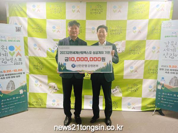 신한은행 강원본부(본부장 우준식)에서 2월 22일(수) ‘2023 강원세계산림엑스포’ 성공개최를 기원하며 (재)강원세계산림엑스포조직위원회(조직위원장 김진태)에 후원금 1천만원을 기탁했다.