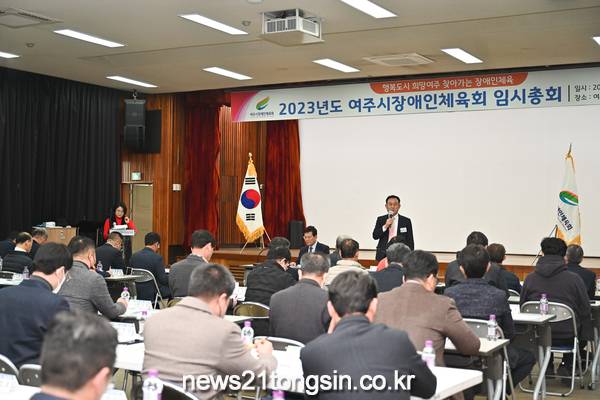 여주시장애인체육회는 지난 22일 여주시청 대회의실에서 여주시장애인체육회장인 여주시장(이충우)을 비롯한 수석부회장(고광만) 등 임원 53명과 대의원 6명이 참석한 가운에 2023년도 첫 임시총회를 가졌다.