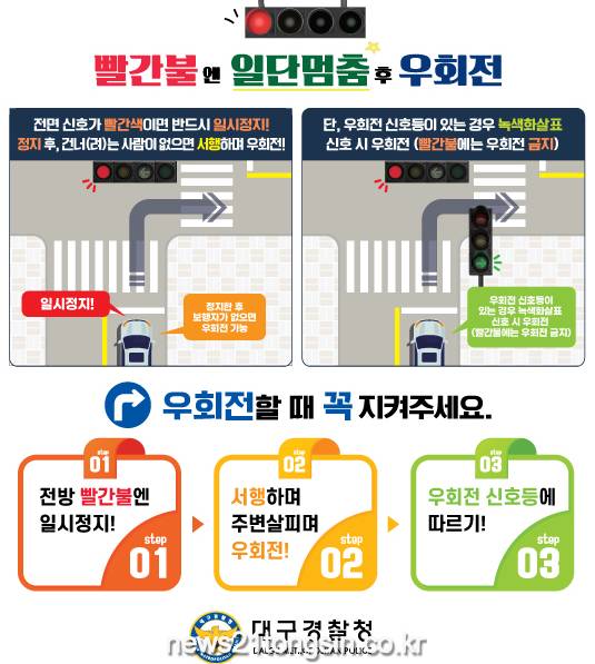 (뉴스21통신) 유재원기자 = 대구경찰청에서는 교차로에서 전방 차량 적색 신호에 우회전 시 일시 정지 의무를 강화하는 개정 도로교통법에 대한 집중 홍보 기간(2.27 ~ 3.12, 2주간)을 운영하며 적극적인 현장 계도 및 홍보활동을 전개한다.