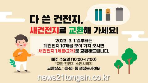 폐건전지 교환장소는 각 읍·면·동 행정복지센터이며, 매주 수요일(오전 10시부터 오후5시) 이뤄진다. 가정에서 사용한 폐건전지 10개(규격에 상관없이)를 가져오면 새건전지 1세트(2개)를 교환해주며, 1인당 월 최대 80개까지 교환 가능하다. 단 공동주택관리사무소, 수거업체, 사업장 등에서 나오는 폐건전지는 교환해주지 않는다