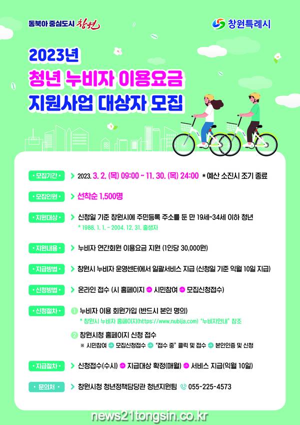창원특례시(시장 홍남표)는 청년들의 복지증진 및 자전거 이용 활성화를 위해 『2023년 청년 누비자 이용요금 지원사업』 참여자를 3월 2일부터 선착순 1,500명모집한다고 28일 밝혔다.