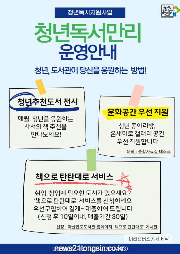 마산합포도서관 정진성 과장은 “도서관이 청년의 꿈을 응원하기 위해 조금이나마 힘을 보태겠다.”며 “앞으로도 우리 청년들이 창의적인 문화적 역량을 펼칠 수 있도록 적극 지원하겠다.”고 밝혔다.