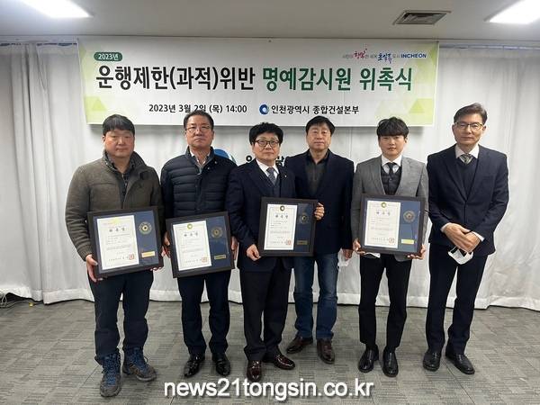 인천광역시(시장 유정복)는 2일 오후 인천종합건설본부 상황실에서 23년도 과적 차량 운행 제한 위반 명예감시원 5명을 위촉했다고 밝혔다.‘운행 제한 위반 명예감시원 제도’는 차량의 운행 제한 규정의 위반행위를 감시하고 건전한 화물운송 질서를 확립하기 위해 지난 2006년에 도입됐다.